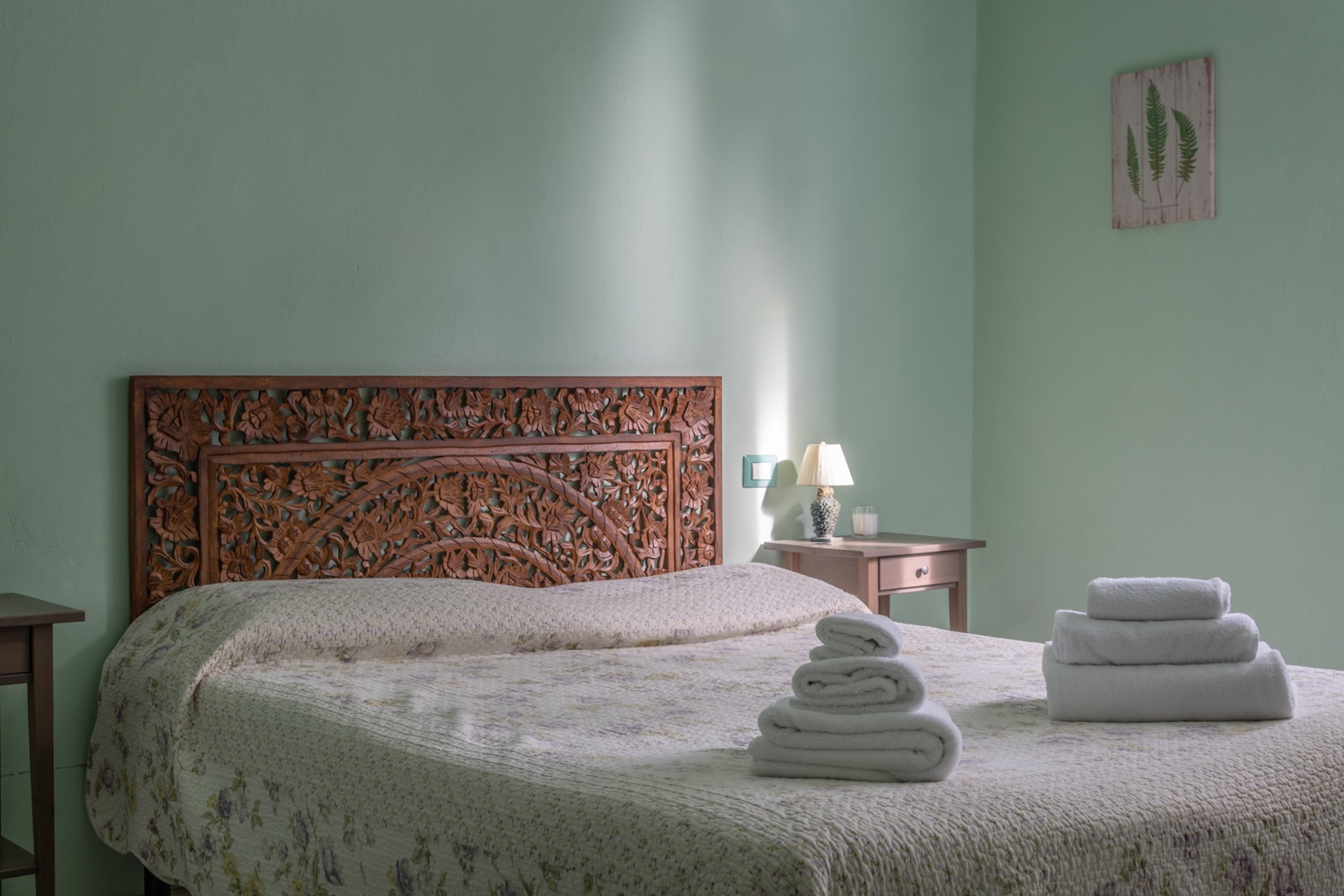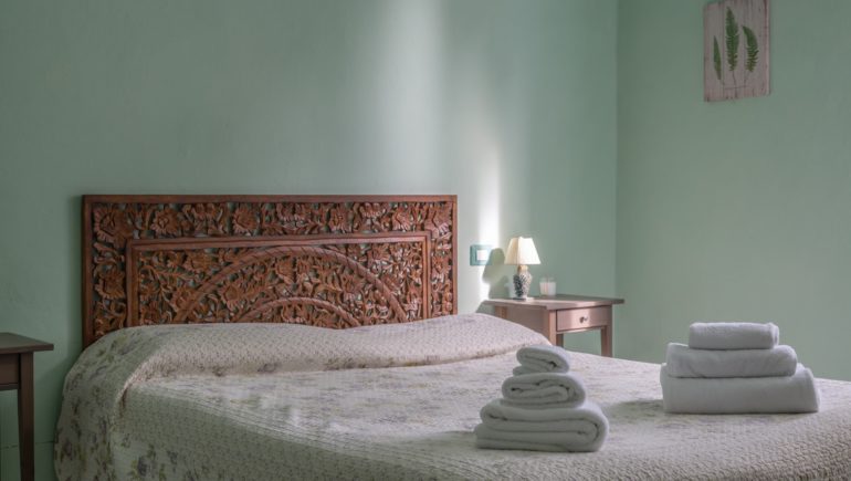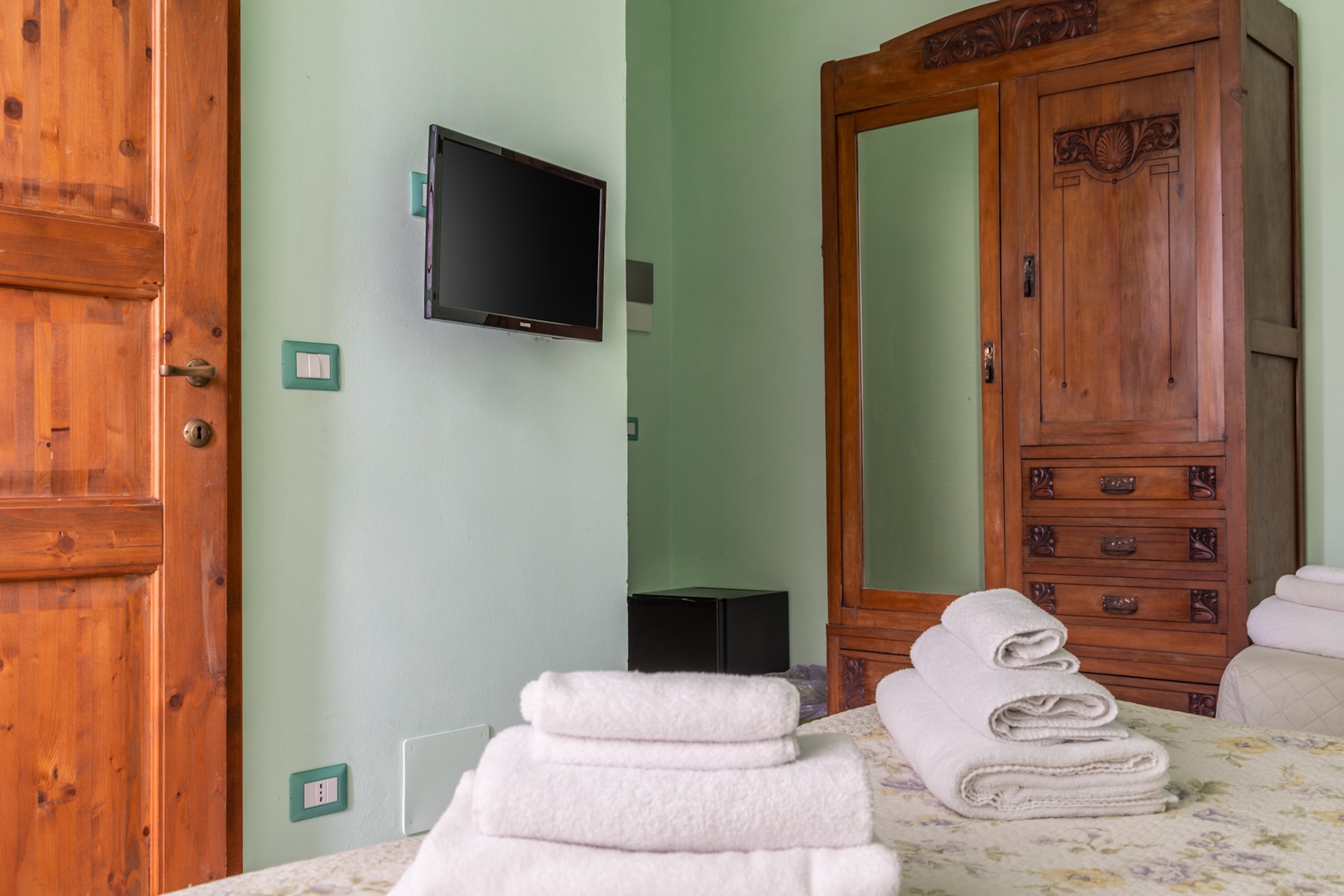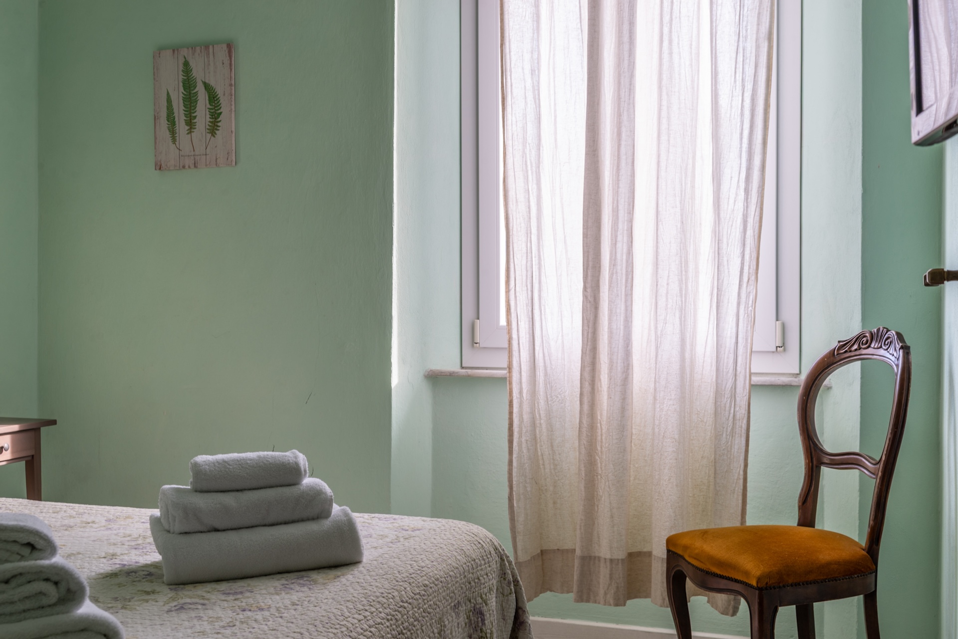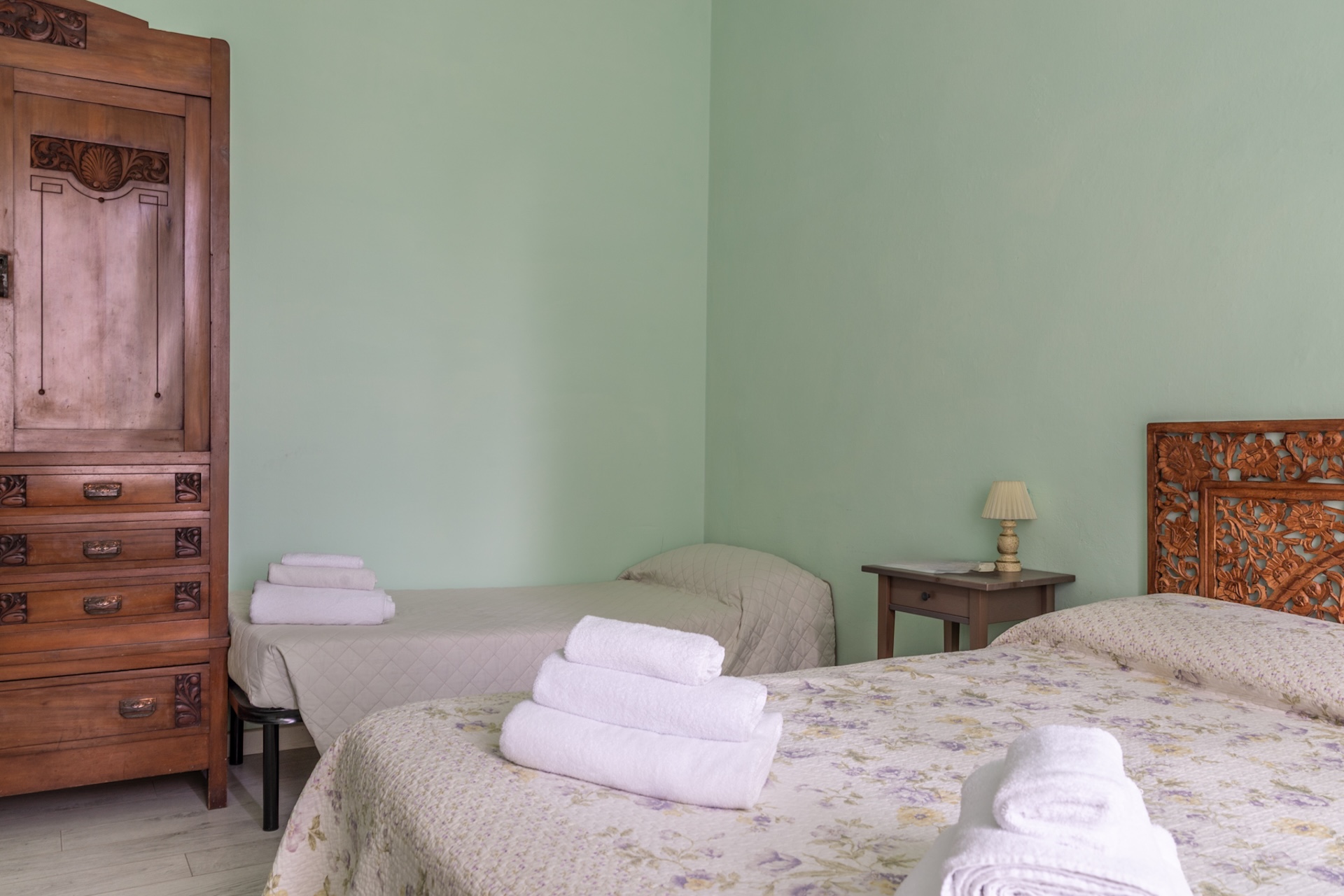 Il colore predominate è il verde ed è arredata con mobili antichi sul color marrone.