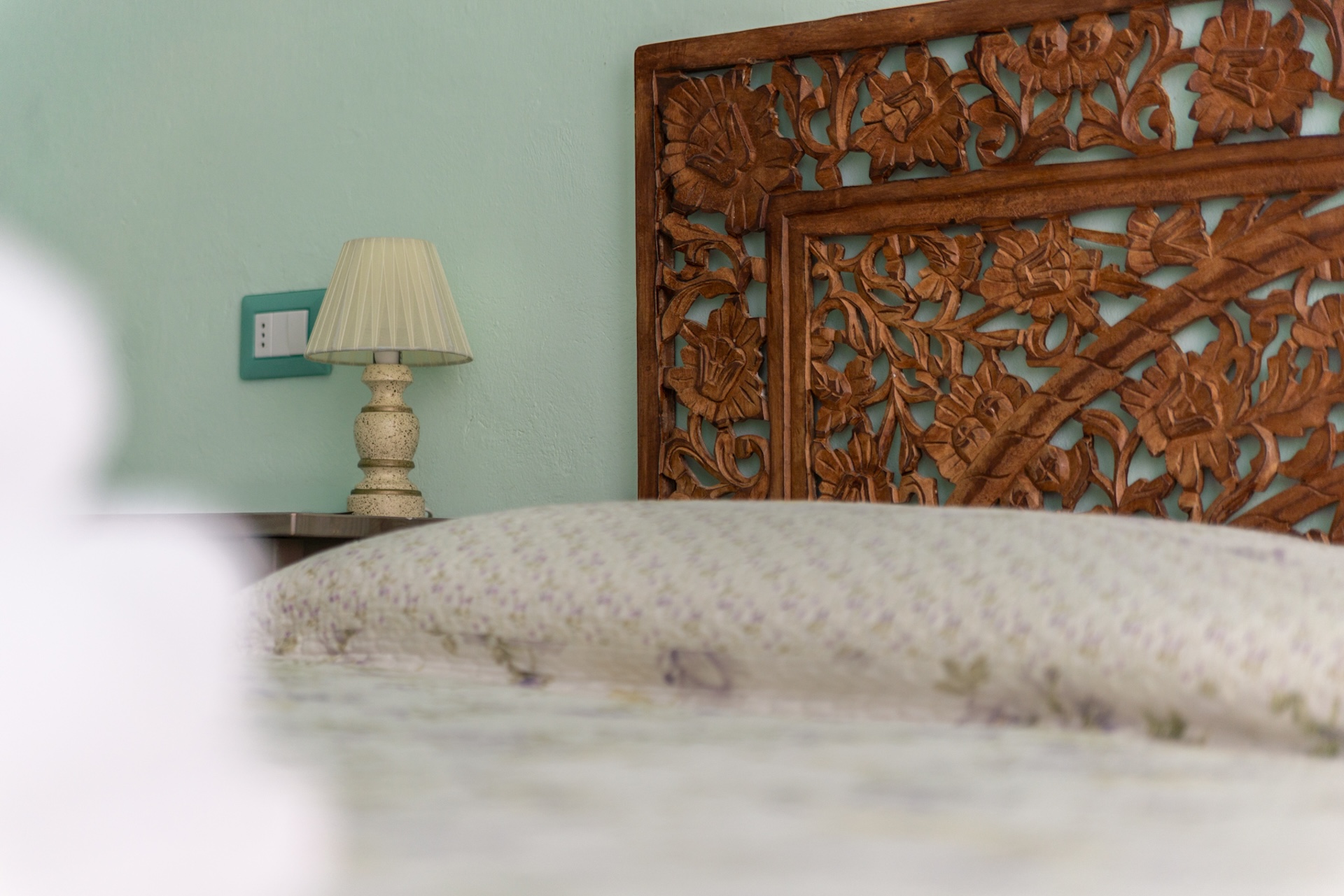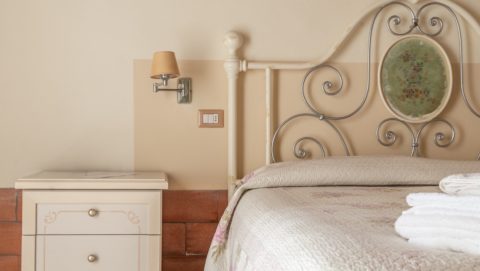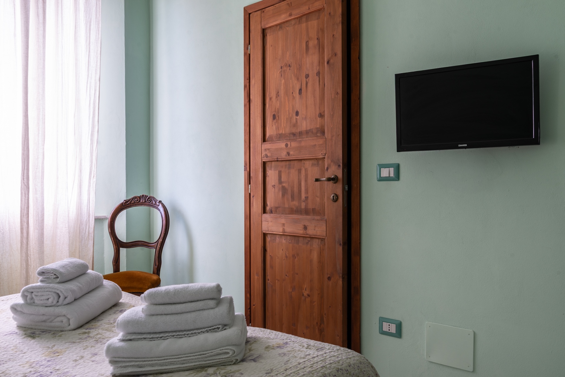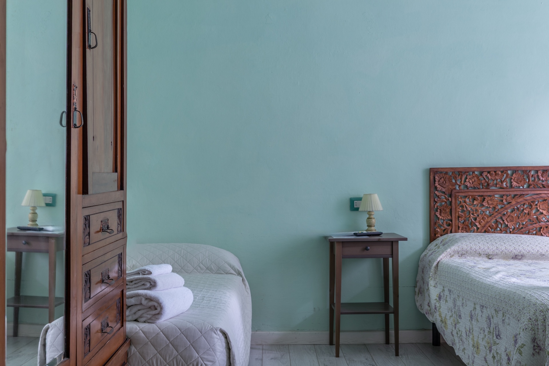 Il colore predominate è il verde ed è arredata con mobili antichi sul color marrone.
